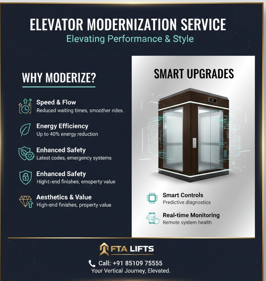 Elevator modernization is a comprehensive upgrade process aimed at improving the performance, safety, efficiency, and appearance of an existing elevator without fully replacing the entire system. Over time, elevator components such as control panels, motors, mechanical parts, safety devices, and cabin interiors can become outdated due to wear and tear, changes in building usage patterns, evolving safety standards, or advancements in elevator technology. Modernization helps breathe new life into these older systems by introducing modern controls, energy-efficient drives, advanced safety mechanisms, and contemporary finishes that enhance both functionality and user experience. FTA Lifts’ modernization services in Noida focus on several key areas of improvement. First, they upgrade critical technical components — such as switching to microprocessor-based control systems — which enable smoother, quieter operation, better floor-leveling accuracy, and improved traffic handling in buildings with heavy passenger flow. Mechanical parts like brakes, door operators, and hoisting machinery are also replaced or refurbished to meet current performance and safety standards, reducing unexpected breakdowns and improving reliability.